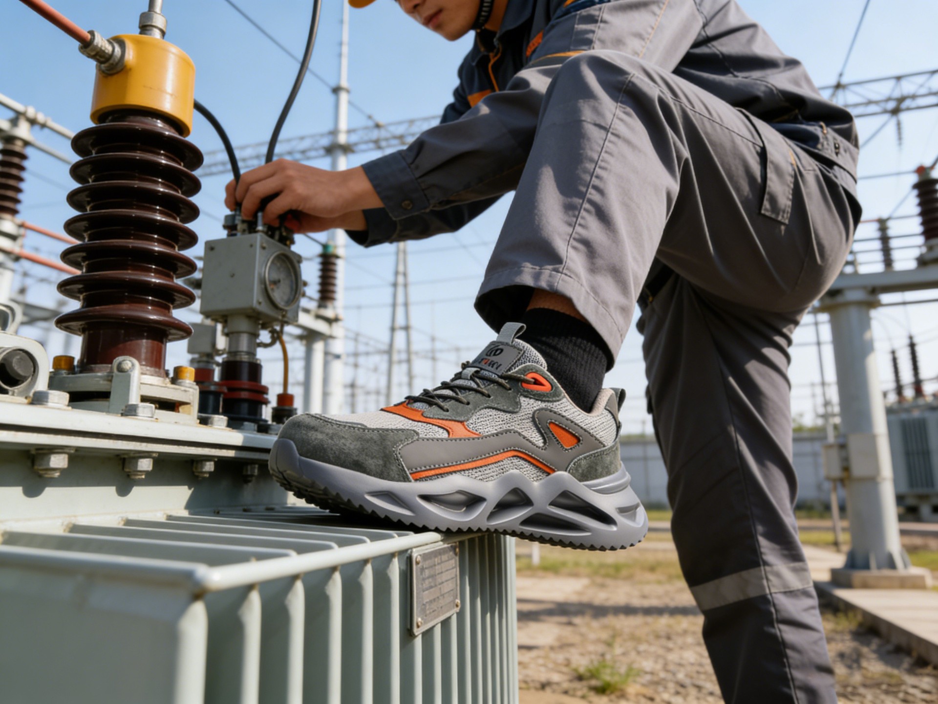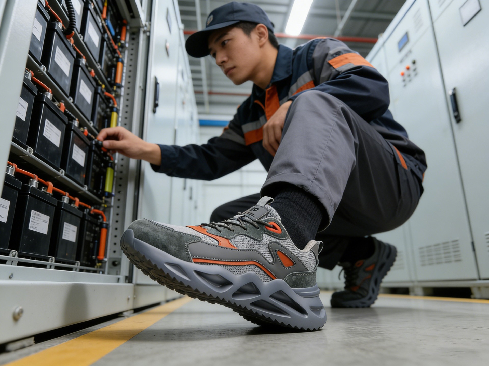 本款安全鞋采用高弹轻便 MD 组合鞋底,兼具出色缓震性能与轻量化优势,行走更省力;帮面 精选头层绒皮与3D 双层透气复合网布,兼顾耐磨防护与透气排汗,有效避免闷脚。内里采用抗菌 防臭新棉材质,能抑制细菌滋生,保持鞋内干爽舒适;搭配减震鞋垫,进一步提升行走缓冲感,减 轻足部压力。同时配备非金属防护设计,无金属部件,过安检更便捷,适合工厂、物流、建筑等多 场景作业,在安全防护与穿着体验间实现了出色平衡。